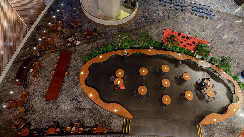 咖啡厅位于国家大剧院一层公共大厅东西两侧。宽敞开阔的空间,流线型的空间设计,温暖柔和的灯光,浓郁的咖啡香气,让每一位经过这里的人不由放慢脚步,享受这份难得的悠闲惬意。这里不仅为络绎不绝的参观旅游者提供休憩场所,更为演出观众提供了中场休息时的绝佳去处。
